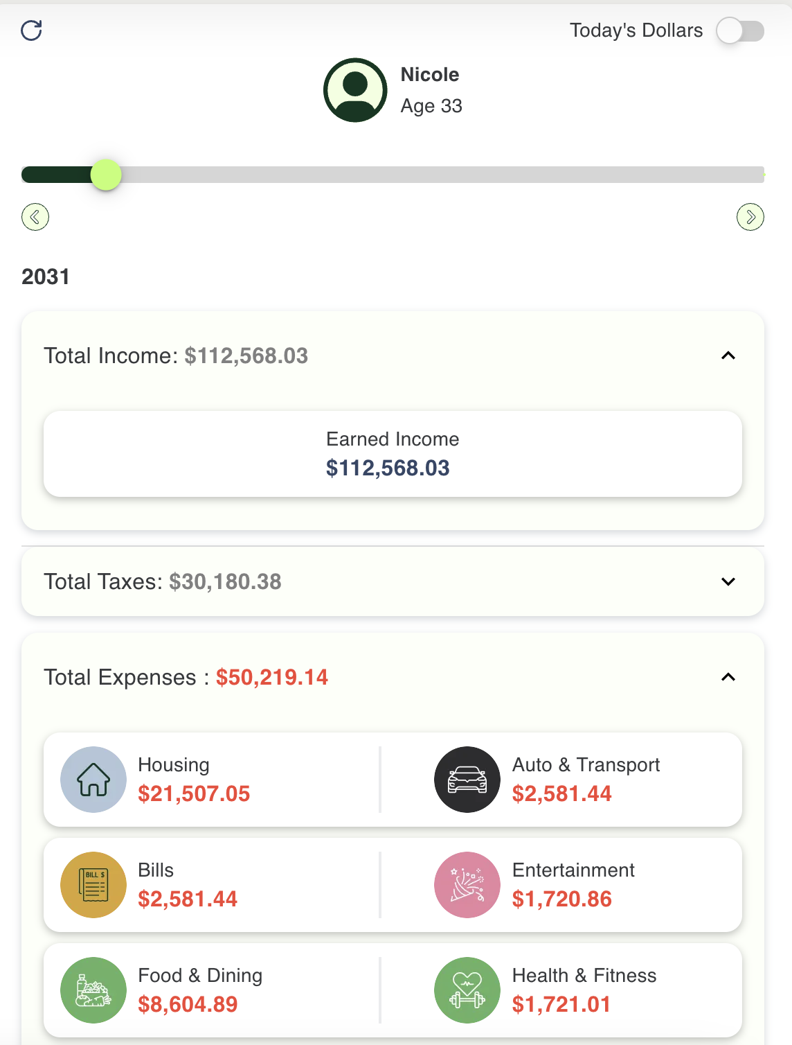 In this example, Nicole would be 33 years old in the year 2031. Her total income is projected to be $112,568.03, and after accounting for taxes of $30,180.38 and expenses totaling $50,219.14, she has a clear view of what’s left to invest or save. Every category is broken down—from Housing to Food & Dining—so she can spot where her money is going and where she can adjust.